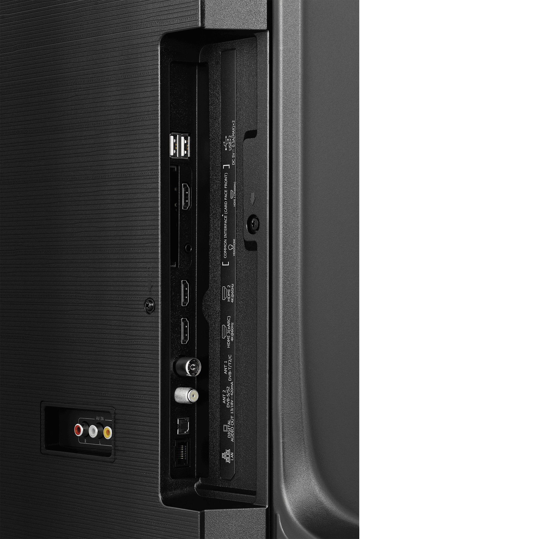 Входы HDMIx3, LAN разъем (RJ45), USBx2, разъем для модуля DVB CAM, разъем для наушников 3.5 мм, Композитный вход 1, Аудиовход для ПК (3.5 мм)x1