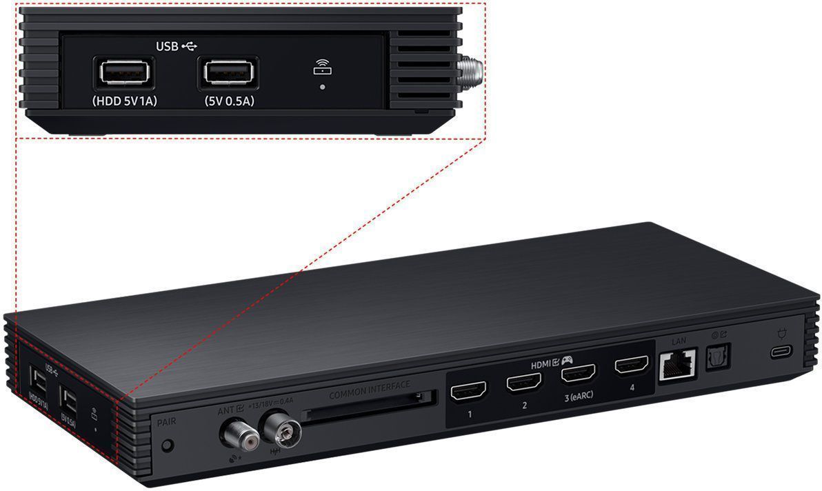 Входы Ethernet - RJ-45, 2 x USB-A, 1 x USB-C, вход HDMI x 5 (8K 60 Гц, 4K 165 Гц (для HDMI 1/2/3/4), выход аудио цифровой оптический, слот CI/CI+